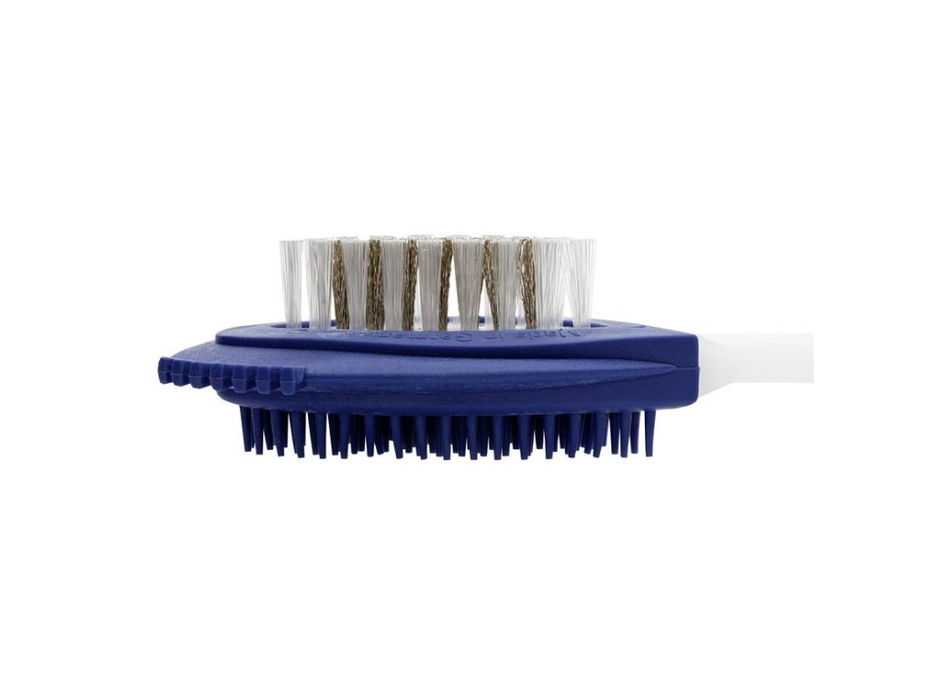 - Strana s mosaznými drátky a nylonovými štětinkami – šetrně oškrábe bláto a vyčistí povrch obuvi.