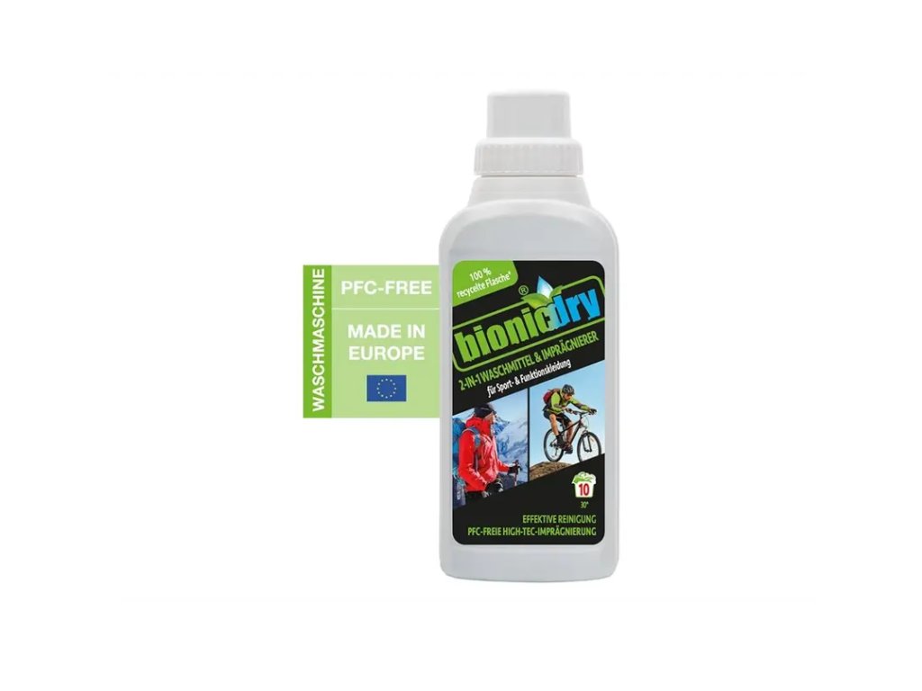Bionicdry® 2v1 je špičkový prací gel a impregnace v jednom. Navržen pro sportovní, funkční a outdoorové oblečení i obuv – perfektně čistí, zároveň obnovuje vodoodpudivost a chrání funkční materiály včetně TEX membrán. Ekologické složení bez PFC.