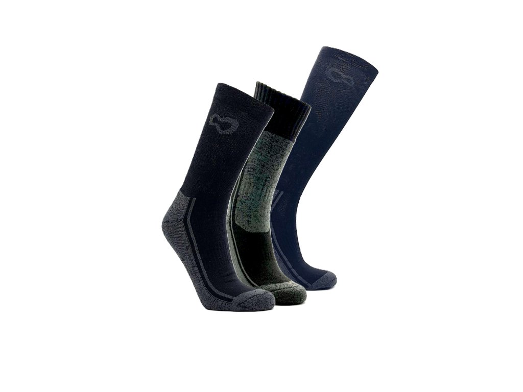 V sadě jsou tyto ponožky: Celoroční antibakteriální podkolenky s lehkou kompresí PRO-OPS High + Celoroční zátěžové antibakteriální ponožky PRO-OPS + Zátěžové zimní ponožky PRO-MERINO